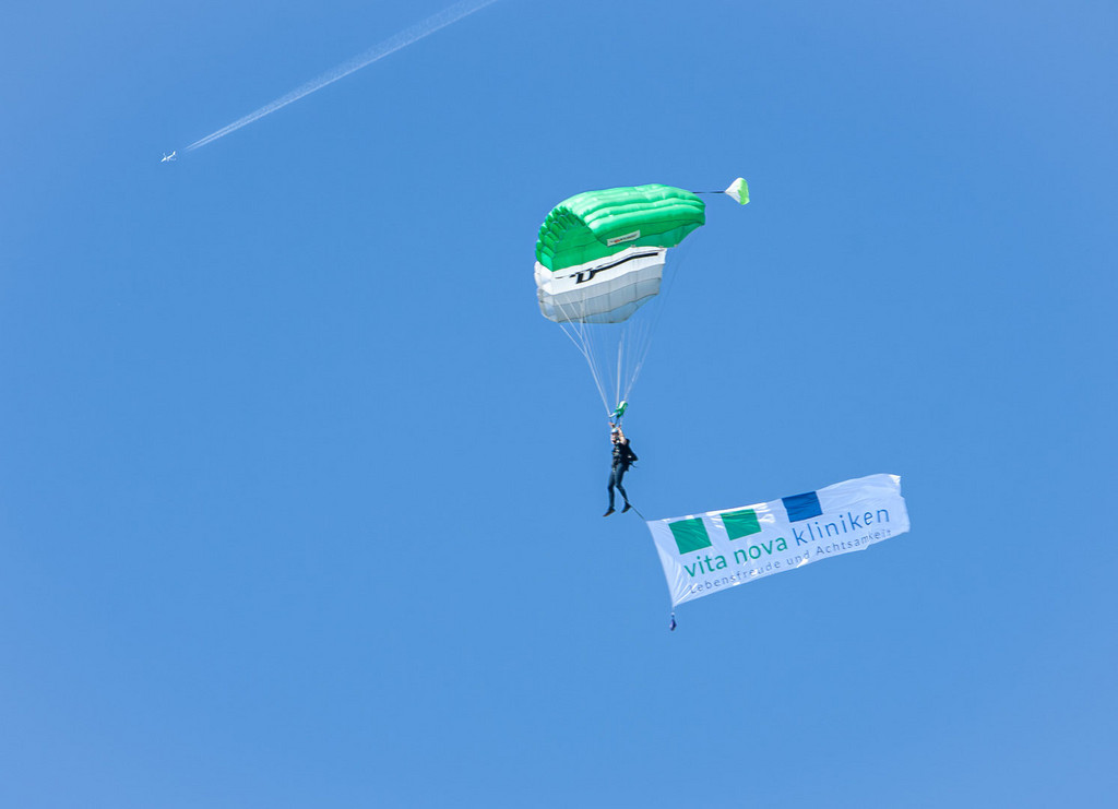 Auch vor dem Sprung mit der Flagge der vita nova kliniken war ich durchaus sehr aufgeregt. Dies ging allerdings nicht ohne dazugehöriges Training, viele Sprünge mit erfahrenen Trainern und immer größeren Flaggen bis wir schlussendlich auf einen Tag gewartet haben an welchem alles passte; Wind, Wolken, Kamerateam sowie eine passende Anflugrichtung.