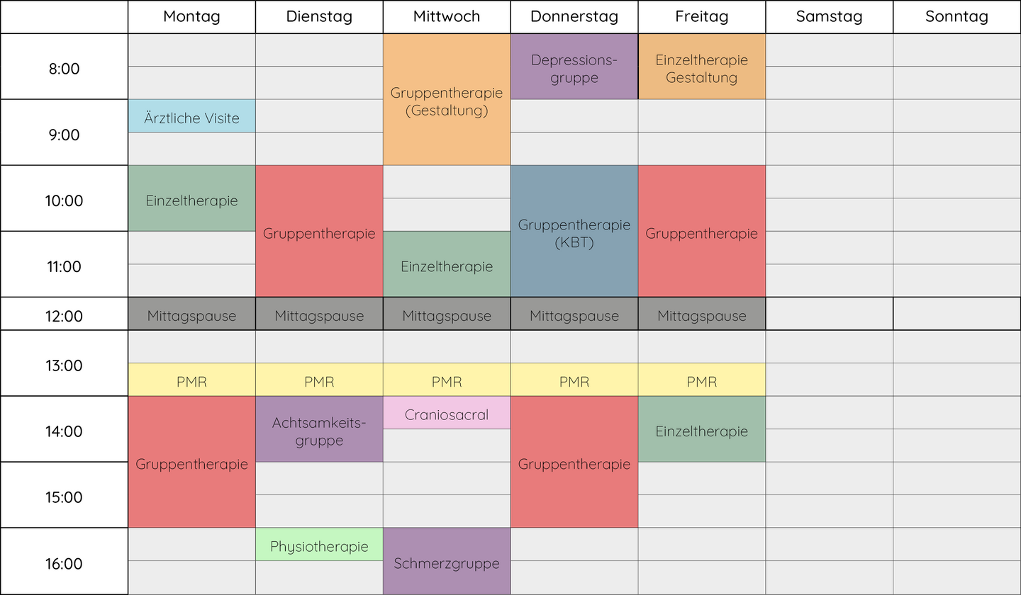 In den ersten Tagen wird gemeinsam Ihr individueller Therapieplan erstellt, der medizinische, psychotherapeutische und ergänzende therapeutische Bausteine sinnvoll verbindet. Innerhalb der ersten Woche findet zudem eine neurologische Aufnahmeuntersuchung statt, um körperliche Ursachen der psychischen Beschwerden auszuschließen oder weiter abzuklären und gegebenenfalls physiotherapeutische Maßnahmen wie Krankengymnastik, manuelle Therapie, Massagen oder Wassergymnastik zu verordnen – teilweise in Kooperation mit der im Haus ansässigen Physiotherapiepraxis MEDIFIT.